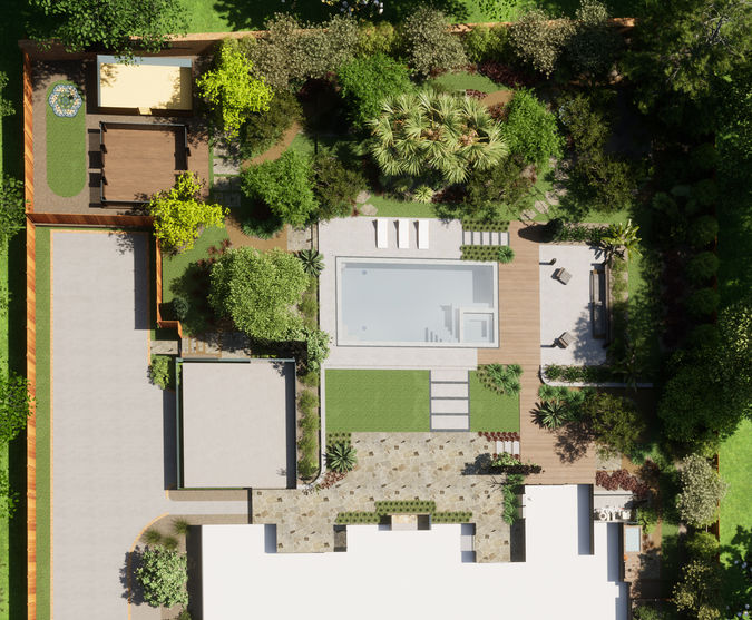 The incorporation of natural materials, a minimal lawn, and a diverse array of lush native and tropical plants lends an upscale yet relaxed ambiance to the landscape.